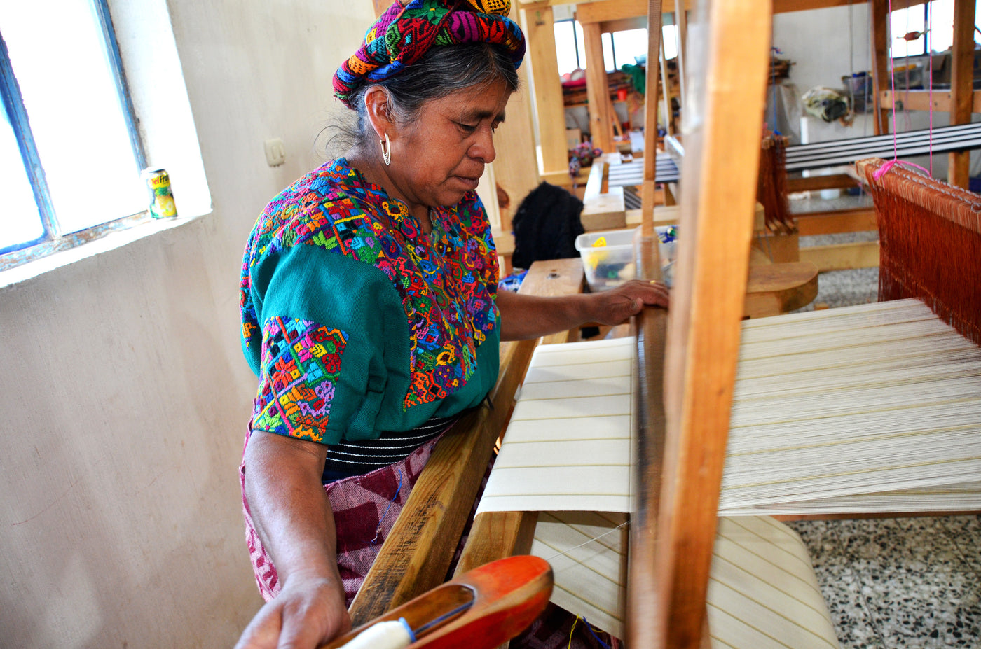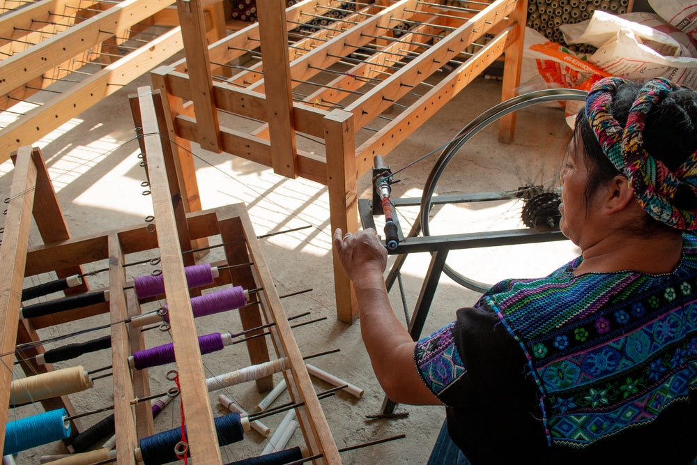 In Cajolá, the Western highlands of Guatemala, we work with a cooperative of women pedal loom weavers. Traditionally, men are pedal loom weavers in this region, but the women saw pedal loom weaving as a more commercially viable way to support themselves and decided to break tradition.