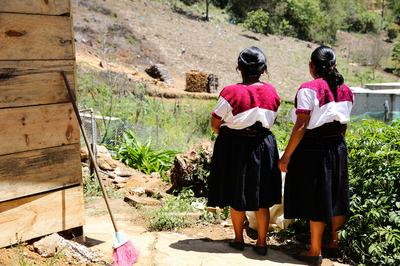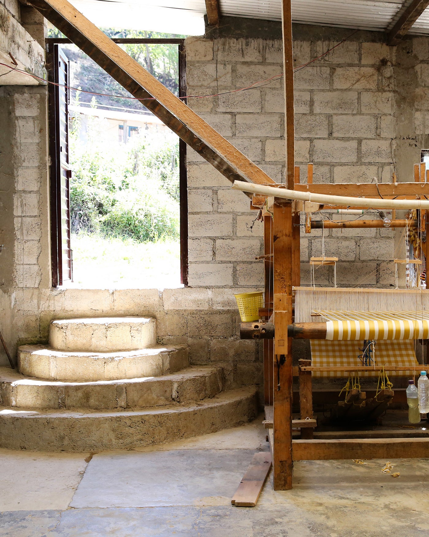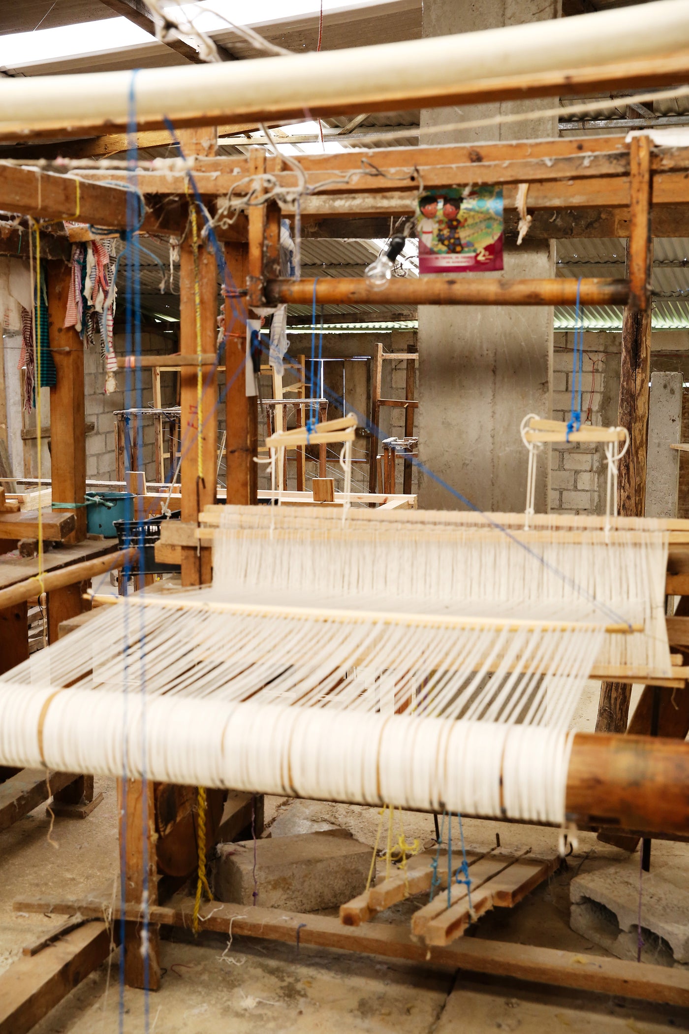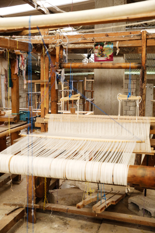 In Larrainzar we work with two family-run workshops of pedal loom weavers. The first workshop we began working with has over 50 operating looms and employs many weavers in the region. Looking out at the mountains below, the view from atop the workshop is one of our favorites.
