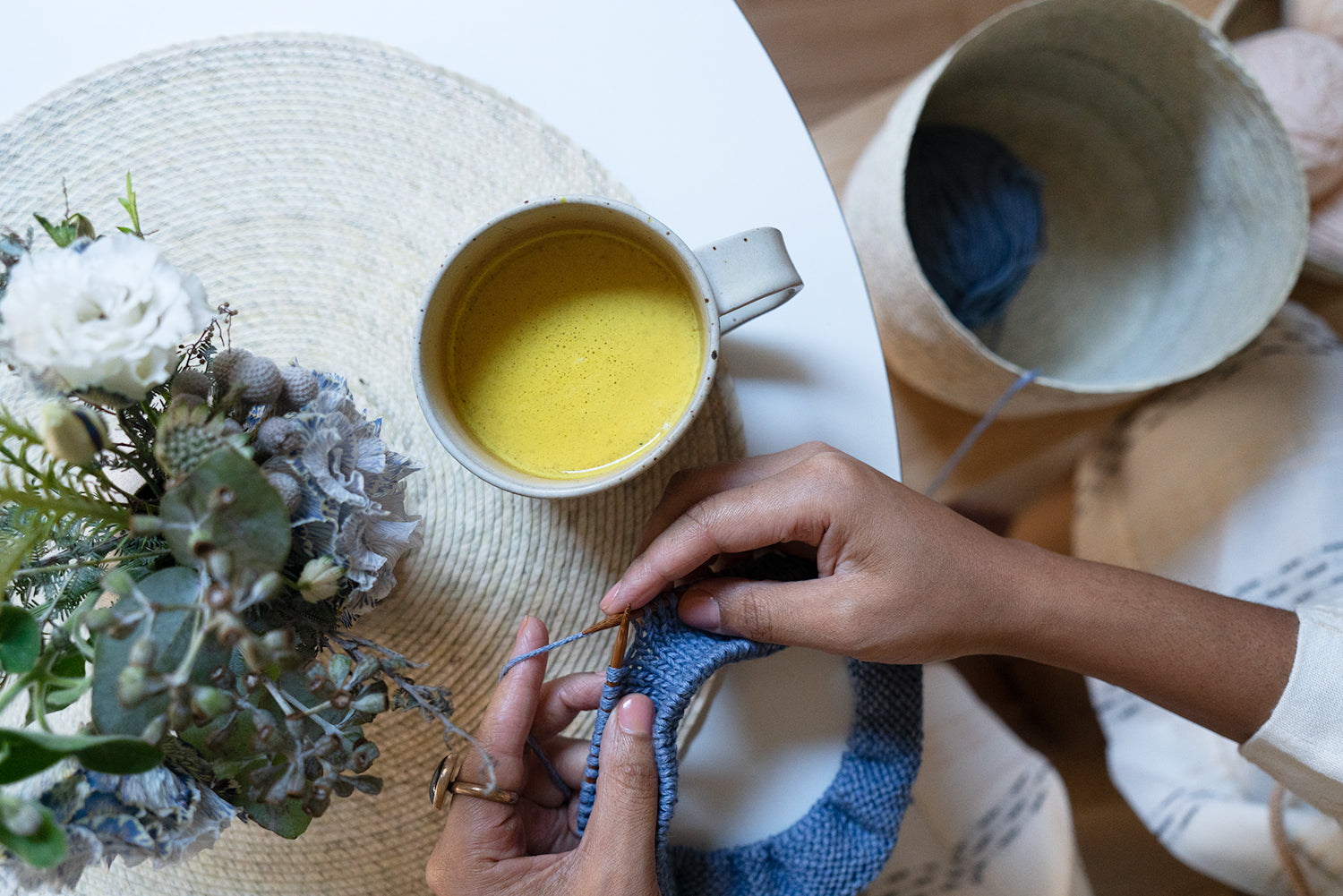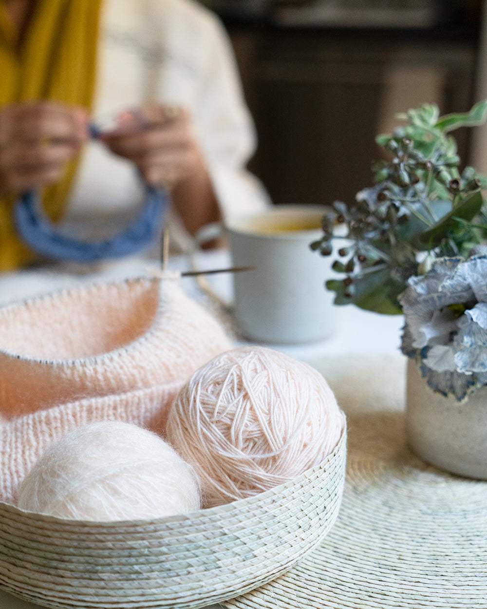 I’m Brandi. I live in Brooklyn, NY with over 30 plants and my partner. In three words, a queer homebody knitter. I write knitting patterns on how to make modern handmade knitwear. My book Knitting for Radical Self-Care: A Modern Guide encourages us to rest, own our power, speak our minds, and build the world we want to see by supporting our creativity. I studied vocal music at Fiorella H. LaGuardia High School and international politics with a focus on gender development in college. Yarn was my first love and then I met clay. I threw the vase you see on the table on a potter’s wheel. The flower arrangement was created by my friend, the owner of Saffron Brooklyn. The teacup glaze is called tahini.