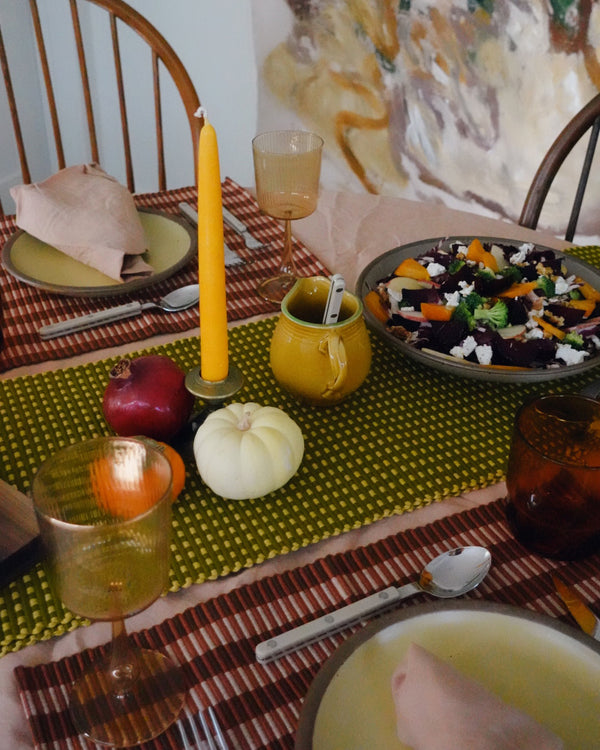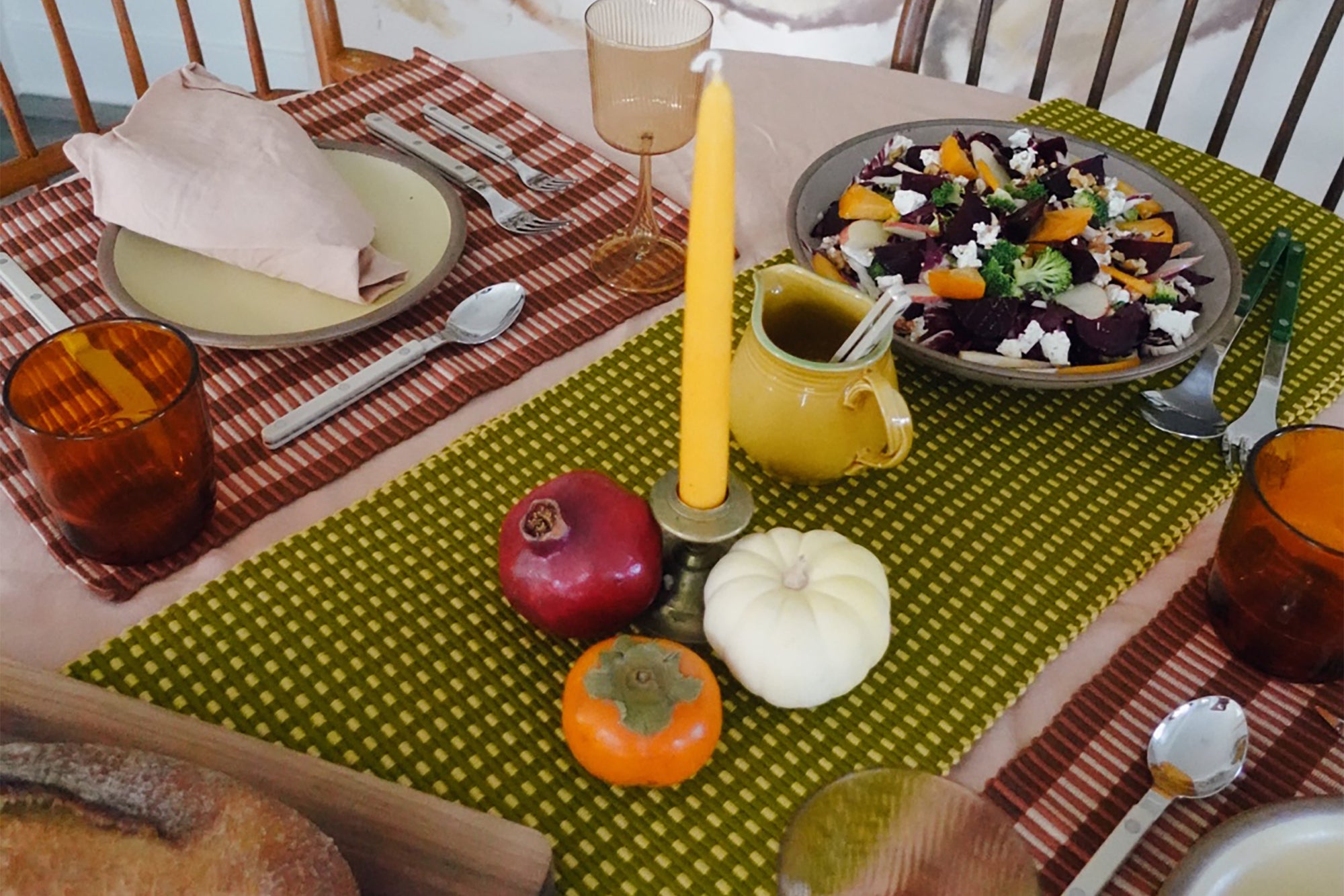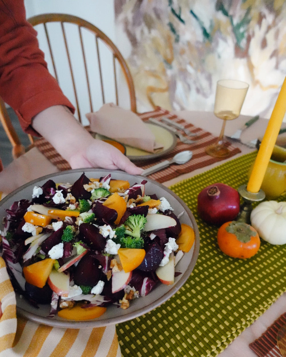 Not so much a recipe, aside from the vinaigrette, but more as a use what you got this fall “harvest salad” type thing! I love salads, and my favorite type of base lettuces are in season in the fall/winter, like lacinato kale and chicories (endive, radicchio, frisée). I typically use one or both, depending on what I have on hand as my base. Then I add in whatever seasonal veg I have around, and love to have one be roasted, and one be raw. In this case I used broccoli that I chopped into small florets, and roasted some baby beets. Roasted delicata squash, acorn squash, carrots, or sweet potato would be other great options. As for raw veg, carrots, cauliflower, and red onion are some good ones. Fruit feels like a must in harvest salads, like pear, apple, persimmons, or pomegranate seeds. I went with an apple and persimmon for this salad.