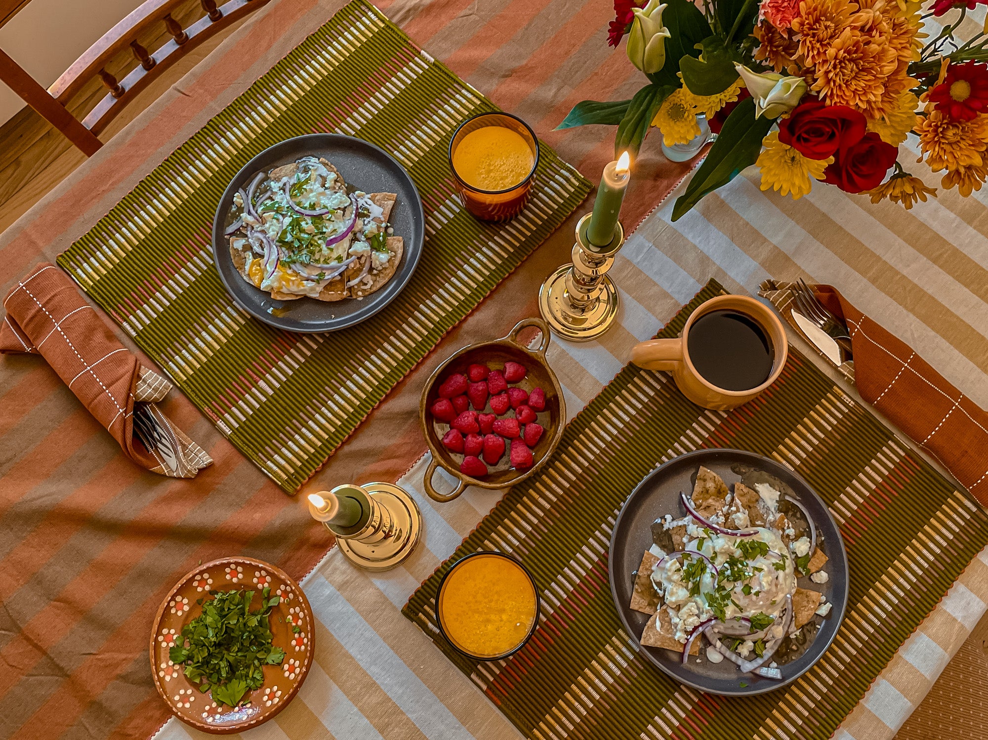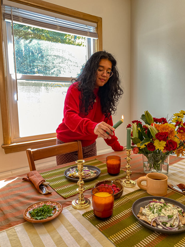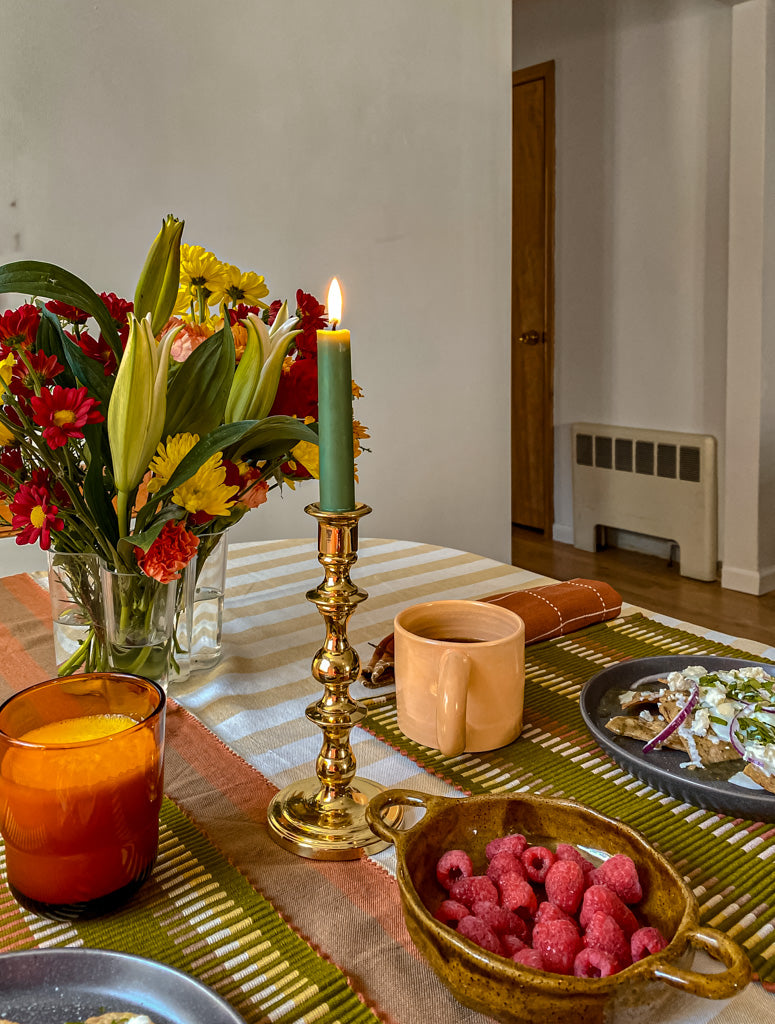 - LIGHT UP SOME CANDLES: My favorite candlesticks are a pair of two vintage gold ones that my roommate thrifted and gave to me. They elevate every meal! And unscented tea lights are also great, too.