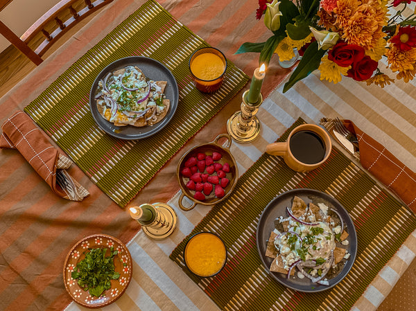 - ADD SOME PLACEMATS: The Ridges Placemats in Starling is my favorite. I love the green colors because it brings vividness to the table. Adding placemats on top of the tablecloth adds texture to a table and the layering effect just looks so nice!