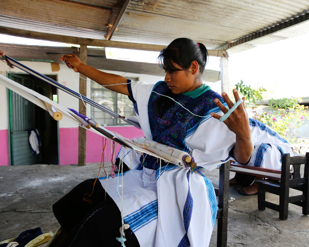 Backstrap weaving is an Indigenous textile technique commonly practiced by women. The loom is worn around the weaver’s hips limiting the textile width. Weavers use their body to create the tension needed to weave each design.