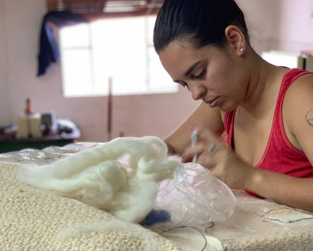 The felting process is manual by design. Long, loose, unwound swaths of wool fiber called Top are joined with a base fabric by puncturing both layers repeatedly with needles.