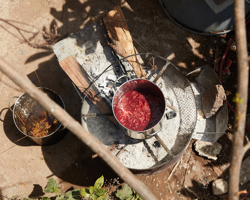 Natural dyeing is our response to creating more environmentally sustainable methods of production. Natural dyes are created in small-batch dye baths out of natural materials such as flowers, indigo, cochineal, nuts, and more.